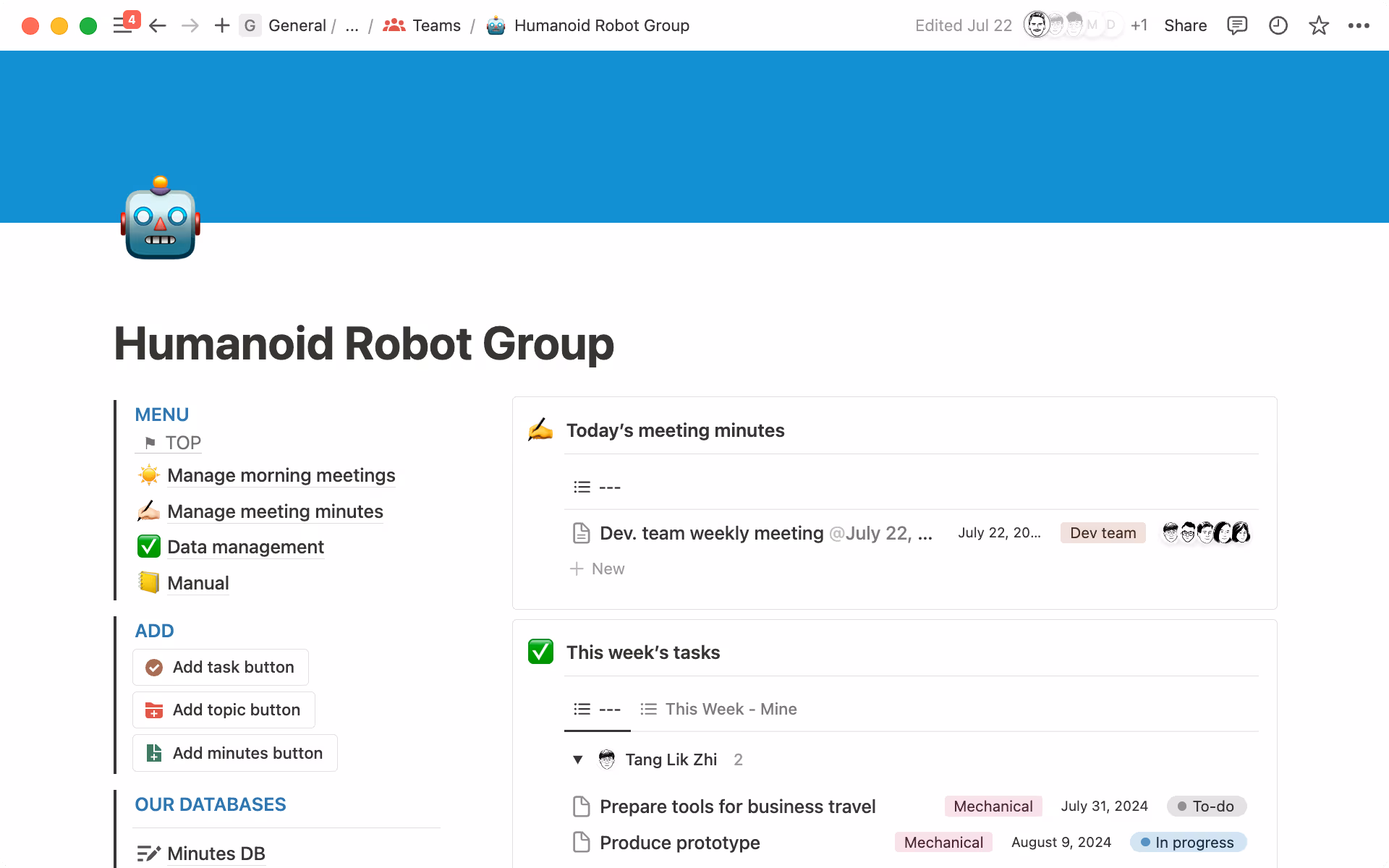 The group conducting R&D on humanoid robots struggled to efficiently use their meeting minutes and background information because they were stored in different places.